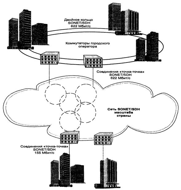 Рис. 4. Стек протоколов и структура сети SONET/SDH