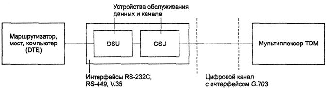 DSU преобразует сигналы, поступающие от DTE (обычно по интерфейсу RS-232C, RS-449 или V.35). DSU выполняет всю.синхронизацию, формирует кадры каналов Т1/Е1, усиливает сигнал и осуществляет выравнивание загрузки канала. CSU выполняет более узкие функции, в основном это устройство занимается созданием оптимальных условий передачи в линии. Эти устройства, как и модуляторы-демодуляторы, часто обозначаются одним словом DSU/CSU (рис. 9).