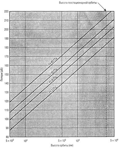 Потери для точек земной поверхности, удаленных от экватора, но все еще видимых со спутника, будут несколько больше. Максимальное расстояние (от спутника до горизонта) для геостационарного спутника равно 42 711 км. Потери в свободном пространстве при прохождении сигналом такого расстояния равны: