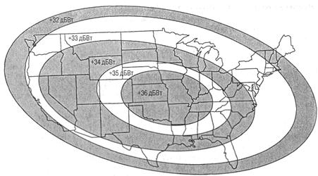 Для работы на СВЧ, которые используются в спутниковой связи, применяются узконаправленные антенны. Таким образом, сигнал со спутника не распространяется во все стороны, а нацеливается на определенную точку Земли. Выбор точки прицела производится с учетом местоположения и размеров области, которая должна покрываться. На центральную точку этой области придется наиболее мощный сигнал, интенсивность сигнала будет спадать по мере удаления от центральной точки в любом направлении. Этот эффект обычно демонстрируется на примере модели, называемой следом спутника (satellite footprint), представленной на рис. 8. Показано, какая эффективная часть излученной энергии антенны попадает в каждую точку на территории США. Результат зависит от мощности сигнала, поступающего в принимающую антенну, а также от направленности передающей антенны. В рассматриваемом примере мощность сигнала, принимаемого в Арканзасе, составляет +36 дБВт, а в Массачусетсе — +32 дБВт. Чтобы получить реальную мощность сигнала, принимаемого в каждой точке покрываемой области, из эффективной мощности, указанной на рисунке, следует вычесть потери в свободном пространстве.