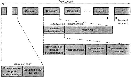 Типичный формат кадра показан на рис. 15. Как правило, кадр начинается с двух опорных пакетов, определяющих начало кадра, эти два пакета предоставляются двумя разными наземными станциями, так что система может продолжать функционировать даже при потере связи с одной из опорных станций вследствие неисправности. Каждый опорный пакет начинается с последовательности для восстановления тактовой синхронизации и несущей, являющейся уникальной и позволяющей синхронизироваться с центральным тактовым генератором. Каждой из N станций выделяется один или несколько интервалов в кадре. Станция использует выделенный ей интервал для передачи пакета данных, состоящего из предварительной последовательности и пользовательской информации. Предварительная последовательность содержит управляющую информацию и информацию о синхронизации плюс данные, идентифицирующие станцию назначения. Отдельные пакеты разделены защитными интервалами, предотвращающими наложение данных.