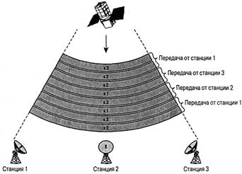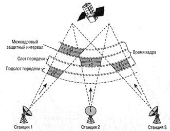 На рис. 16 показан принцип действия систем FAMA-TDMA. Отдельные наземные станции по очереди используют восходящий канал связи и могут помещать пакеты данных в выделенные для них временные интервалы. Спутник ретранслирует входящие данные всем станциям. Таким образом, передача и прием информации каждой станцией осуществляется в определенный временной интервал. Спутник также повторяет опорные пакеты данных, поэтому все станции, принимающие эти пакеты, имеют возможность синхронизировать свою работу.