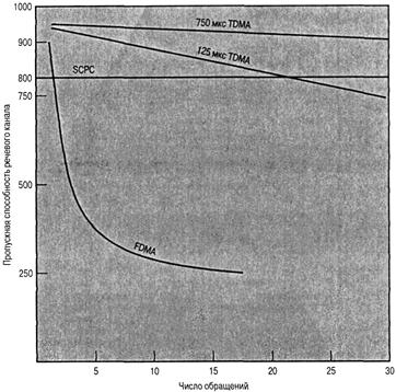 Обычная схема ТDМА эффективнее традиционной схемы FDMA, так как на защитные интервалы и управляющие биты TDMA расходуется меньшая пропускная способность, чем на защитные полосы FDMA. Это проиллюстрировано на рис. 17. Обратите внимание на существенное падение пропускной способности для FDMA по мере увеличения числа каналов. В случае использования схемы TDMA при увеличении числа временных интервалов (тех же каналов) пропускная способность уменьшается гораздо медленнее. Кроме того, при использовании более длинных кадров также увеличивается эффективность связи. Для сравнения, система SCPC обеспечивает постоянную пропускную способность в 800 каналов, независимо от того, поделена ее полоса частот между множеством станций или между всего несколькими наземными станциями.