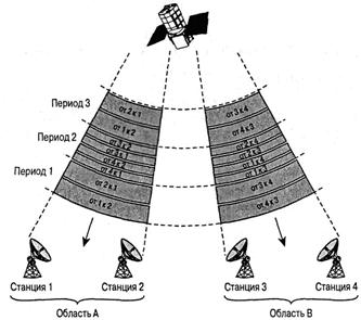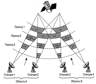На рис. 18 показана простая система SS/TDMA, обслуживающая две зоны, в каждой из которых расположено по две станции. Как и в обычной схеме TDMA, в пределах одной зоны в каждый момент времени передавать может только одна станция. Таким образом, в пределах зоны А в любой конкретный временной интервал может передавать либо станция 1, либо станция 2. Так же ив пределах зоны В передавать в данный момент времени может либо станция 3, либо станция 4. Сигналы со станций из разных зон не интерферируют, благодаря использованию по-разному поляризованных сигналов либо использованию разных частот. На спутнике принимаемые данные тут же ретранслируются на частоте нисходящего канала связи. При этом используются два различных нисходящих луча. На спутнике имеется коммутатор для соединения входящих и выходящих лучей. Варианты соединений, выполняемых коммутатором, могут меняться со временем. На рисунке нисходящий луч А повторяет восходящий луч А в течение периодов 1 и 3 и повторяет восходящий луч В в течение периода 2. Таким образом, любая станция в любой зоне может отправлять данные любой другой станции.