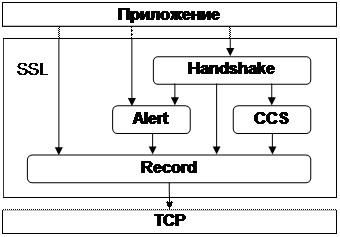 Ha рис. 3 отражено их взаимодействие. Протокол Record находится непосредственно поверх транспортного слоя TCP, в то время как остальные три протокола - между слоем Record и приложением.