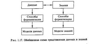 Всегда вызывает интерес соотношение между данными и знаниями, в особенности представления (способы формализации) тех и других, модели представления данных и знаний, поскольку данные и знания — это форма представления информации в ЭВМ (рис. 1.17).