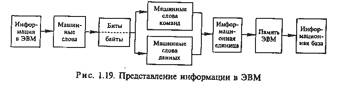 Одинаковое число разрядов в машинных словах для команд и данных позволяет рассматривать их в ЭВМ в качестве одинаковых информационных единиц (ИЕ) и выполнять операции над командами, как над данными. Содержимое памяти образует информационную базу (рис. 1.19).