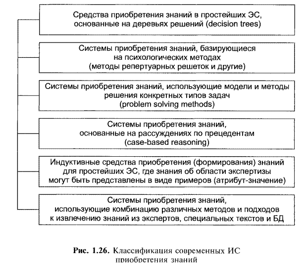 Под приобретением знаний понимается способ автоматизированного построения базы знаний посредством диалога эксперта и специальной программы (при этом структура знаний заранее закладывается в программу). Эта стратегия требует существенной предварительной проработки предметной области. Системы приобретения знаний действительно приобретают готовые фрагменты знаний в соответствии со структурами, заложенными разработчиками систем. Большинство этих инструментальных средств специально ориентировано на конкретные экспертные системы с жестко обозначенной предметной областью и моделью представления знаний, т.е. не являются универсальными.