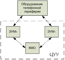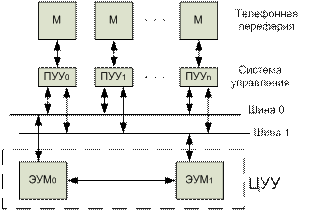 Если структура системы управления централизованная, то в этом случае все процессы по управлению узлом коммутации выполняются в одном центральном управляющем устройстве (ЦУУ). В состав ЦУУ входят две электронные управляющие машины ЭУМ (ЭУМ0 и ЭУМ1). ЭУМ в ЦУУ могут работать в двух режимах: