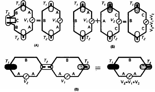 Это значит, что в любое плечо термоэлектрического контура можно внести дополнительный материал С, не боясь изменить результирующее напряжение К, при условии, что оба новых соединения будут иметь одинаковую температуру (Т3 на рис. 16.15А). Здесь нет никаких ограничений на количество внесенных проводников, необходимо только поддерживать одинаковую температуру в местах их подключения. Из этого закона также следует, что термоэлектрические соединения могут выполняться любым способом, даже с использованием промежуточных материалов (например, припоев): сваркой, пайкой, скруткой, сплавлением и т.д.. При этом метод соединения не будет влиять на точность термопар. Из закона 2 вытекает правило введения дополнительных материалов (рис. 16.15Б): Если известны термо э.д.с (V1, и V2)двух проводников (В и С) при их подсоединении к эталонному проводнику А, результирующее напряжение при непосредственном контакте проводников В и С будет равно алгебраической сумме термо э.д.с V1, и V2.