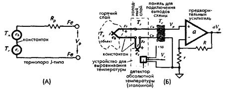 На рис. 16.16А показана эквивалентная схема термопары и термоэлемента, состоящая из источников напряжений eh и ес, соответствующих разности потенциалов Зеебека горячего и холодных спаев, и последовательного резистора. Результирующее напряжение схемы Vр является функцией измеряемой разности температур. Предполагается, что выводы схемы изготавливаются из того же самого материала, например, железа.