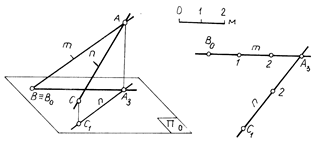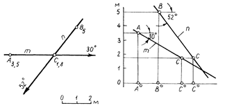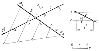 Решая задачу первым способом, построение выполняют в следующем порядке: прямую а интерполируют делением отрезка M4N8 на четыре равных части, а прямую в интерполируют с помощью масштаба заложений. Отметка искомой точки А и в одном, и в другом случаях равна 5,5 м, следовательно, точка А является общей для прямых a и b. На рис.2.14 дан другой способ решения задачи. Построив профиль прямых m и n, определяют отметку искомой точки С. В обоих случаях она равна 1,8 м. В целях сокращения количества построений плоскость профиля прямой m совмещают с плоскостью профиля прямой n. При построении профилей прямых расстояние между основаниями точек А и В берут произвольным. В решении графических задач рассмотренный вид построения профилей носит название сводного разреза.