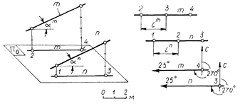 Параллельные прямые. У параллельных прямых m и n углы падения равны (рис.2.15): Ðam = Ðan. Равенство углов определяет равенство заложений: lm = ln. Плоскость профиля прямой m параллельна плоскости профиля прямой n. Следовательно, у параллельных прямых проекции параллельны, заложения равны (углы падения равны), направления падения совпадают: пад.I, т. е. параллельные прямые имеют одинаковые элементы залегания.