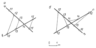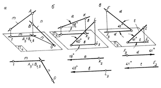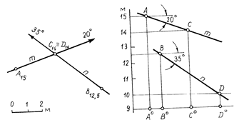 На рис.2.17 взаимное расположение прямых m (А15Ð20°) и n (В12,5Ð35°) определяется построением профиля сводного разреза, из которого следует, что точка пересечения проекций прямых является проекцией двух различных точек пространства, через которые проходят прямые m и n. Высота точки С не равна высоте точки D. Следовательно, прямые m и n скрещиваются, причем прямая m проходит над прямой n. Отметим еще один признак, пользуясь которым можно отличать пересекающиеся прямые от скрещивающихся: прямые линии, соединяющие точки с одинаковыми отметками, и в случае пересекающихся прямых a и b взаимно параллельны (рис.2.18, а), в случае скрещивающихся прямых m и n не параллельны друг другу (рис.2.18, б).