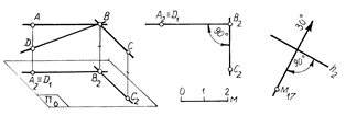 следовательно, проекции углов ABC и DBC совпадут. Отсюда следует, что ÐD1B2C2 = ÐA2B2C2 = 900. Это свойство прямого угла дает возможность строить на плане проекции двух взаимно перпендикулярных прямых, одна из которых является горизонталью.
