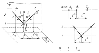На рис.2.20 дан пример построения на плане проекций двух взаимно перпендикулярных прямых, лежащих в одной вертикальной плоскости T. Проекции прямых m и n на плане совпадают m º n. Сумма углов падения таких перпендикулярных прямых равна 900: Ðam + Ðan = 900. Заложение прямой m обратно пропорционально заложению прямой n: lm = H/ ln. Это следует из прямоугольного треугольника ABC, в котором