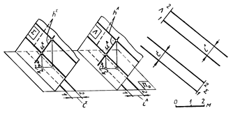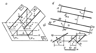 Параллельные плоскости. В проекциях с числовыми отметками признаком параллельности плоскостей на плане служит параллельность их горизонталей, равенство заложений и совпадение направлений падения плоскостей: пл. S || пл. L - h S || h L, l S = l L, пад. I. (рис.3.11).