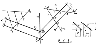 На плане пересекающимися прямыми m и n задана плоскость S. Необходимо построить плоскость L, параллельную плоскости S и отстоящую от нее на расстоянии 12 м (т. е. истинная мощность – H = 12 м). Плоскость L расположена под плоскостью S (плоскость S - кровля слоя, плоскость L - подошва).