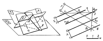 плоскостей S и L горизонтали параллельны. Линией пересечения таких плоскостей будет горизонтальная прямая h. Для нахождения точки A, принадлежащей этой прямой, проводят произвольную вспомогательную плоскость T, которая пересекает плоскости S и L. Плоскость T пересекает плоскость S по прямой а (C1D2), а плоскость L - по прямой b (K1L2).