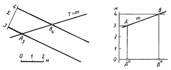 Рассмотрим еще один пример (рис.3.16) построения линии пересечения наклонной плоскости S с вертикальной плоскостью Т. Искомая прямая m определяется точками A и B, в которых горизонтали h 3 и h 4 плоскости S пересекают вертикальную плоскостью T. Из чертежа видно, что проекция линии пересечения совпадает с проекцией вертикальной плоскости: m º T. В решении геологоразведочных задач сечение одной или группы плоскостей (поверхностей) вертикальной плоскостью называется разрезом. Построенную в рассматриваемом примере дополнительную вертикальную проекцию прямой m называют профилем разреза, выполненного плоскостью T по заданному направлению.