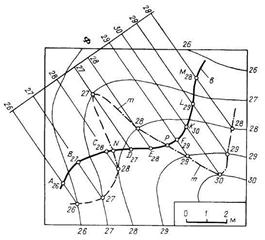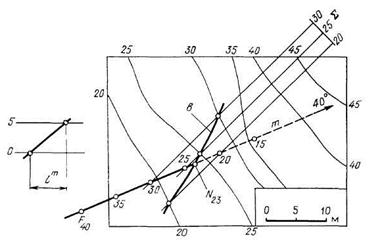 На рис. 6.7 дано другое решение аналогичной задачи. Через интерполированную прямую m (F40 <400) проводят вспомогательную наклонную плоскость Σ. Горизонтали произвольной наклонной плоскости Σ проводят с таким расчетом, чтобы точки их пересечения с одноименными горизонталями топографической поверхности не выходили за пределы чертежа. Плоскость Σ пересекает топографическую поверхность по кривой b. Пересечение на плане проекций прямой m и кривой b определяет искомую точку N.