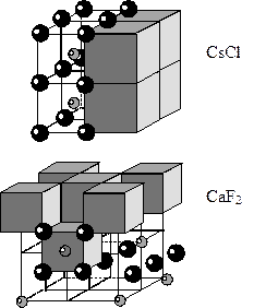 Структура CsCl. Анионным полиэдром в этой структуре является куб. Сама структура изображается в виде кубов, соприкасающихся гранями.