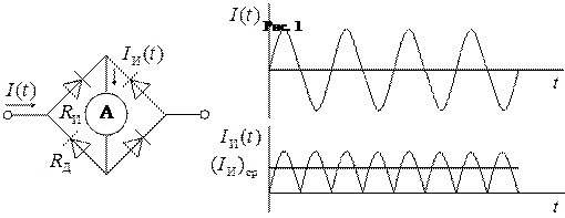 Ток измеряют на основе преобразования переменного тока в постоянный. Для этого необходимо устройство называемое выпрямителем. В качестве примера рассмотрим двухполупериодный выпрямитель (рис. 3). На рисунке также показаны временные графики. Чтобы амплитуда колебаний на измерителе не уменьшалась нужно чтобы выполнялось условие: