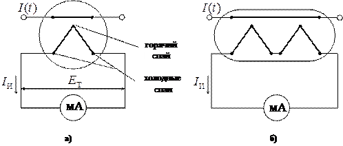 При ВЧ выпрямляющие свойства диодов резко ухудшаются из-за наличия емкости p-n перехода, поэтому для измерения токов высокой частоты применяются термоэлектрические преобразователи (ТЭП). В основе работы ТЭП лежит использование термопары (рис. 4а).