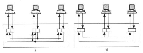 Нужно подчеркнуть, что в работе концентраторов любых технологий много общего - они повторяют сигналы, пришедшие с одного из своих портов, на других своих портах. Разница состоит в том, на каких именно портах повторяются входные сигналы. Так, концентратор Ethernet повторяет входные сигналы на всех своих портах, кроме того, с которого сигналы поступают (рис. 18 а). А концентратор Token Ring (рис. 18 б) повторяет входные сигналы, поступающие с некоторого порта, только на одном порту - на том, к которому подключен следующий в кольце компьютер.
