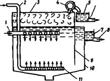 На рис. 8 представлена схема флотационной пневматической установки, предназначенной для очистки сточных вод от маслопродуктов, поверхностно-активных и органических веществ, а также от взвешенных частиц малых размеров. Исходная сточная вода по трубопроводу 1 и отверстиям в нем равномерно поступает во флотатор 10. Одновременно по трубопроводу 2 подается сжатый воздух, который через насадки 11 из пористого материала в виде мельчайших пузырьков равномерно распределяются по сечению флотатора. В процессе всплывания пузырьки воздуха обволакивают частицы маслопродуктов, ПАВ и мелких твердых частиц, увеличивая скорость их всплывания. Образующаяся таким образом пена скапливается между зеркалом воды и крышкой 3 флотатора, откуда она отсасывается центробежным вентилятором 4 в пеносборник 5 и через трубопровод 6 направляется для обработки пены и извлечения из нее маслопродуктов. В процессе вертикального движения сточной воды во флотаторе содержащийся в воздухе кислород окисляет органические примеси, а при малой их концентрации имеет место насыщение воды кислородом. Очищенная таким образом вода огибает вертикальную перегородку 9 и сливается в приемник 7 очищенной воды, откуда по трубопроводу 8 подается для дальнейшей обработки. Эффект флотации зависит от величины отверстий пористого материала, давления и расхода воздуха, продолжительности флотации, уровня воды во флотаторе. По опытным данным размер отверстий должен быть 4-20 мкм при давлении воздуха 0,1-0,2 МПа, расход воздуха 40-70 м3/ч, продолжительность флотации 20-30 мин., уровень воды в камере до флотации 1,5-2,0 м.