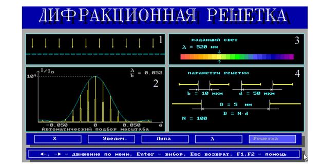 1 - дифракционная решетка; 2 - график распределения интенсивности в дифракционной картине; 3 - параметры света; 4 -параметры решетки.