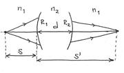 В предыдущей лекции рассматривалось преломление параксиального пучка на двух сферических поверхностях, разделенных промежутком O1O2. Формула тонкой линзы была получена в приближении, что толщина этого промежутка много меньше радиусов кривизны преломляющих поверхностей. Если это не так, то вычисления будут сложнее. Вернемся к нашей системе. Расстояние между вершинами обозначено d.