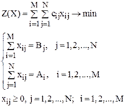 Предположим, что существуют N потребителей и M поставщиков некоторого однородного груза, у каждого из поставщиков определенный запас этого груза (Ai единиц, i=1,2,…,M), а каждому из потребителей требуется Bj единиц груза (j=1,2,…, N). Известны также затраты cij на перевозку единицы груза от поставщика Ai к потребителю Bj. Требуется составить такой план перевозок от поставщиков к потребителям, чтобы суммарные затраты на перевозки оказались минимальными (при этом должны быть по возможности вывезены все запасы поставщиков и удовлетворены все запросы потребителей).