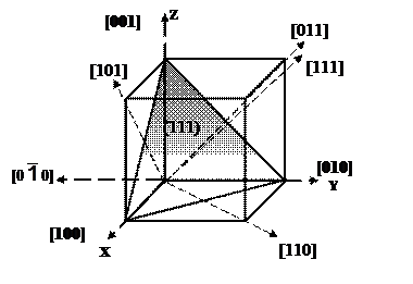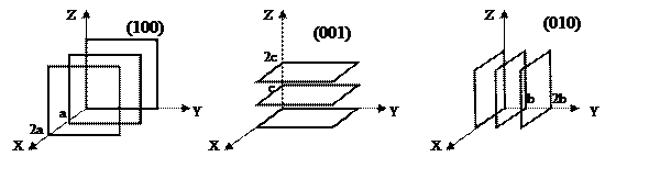 Для задания направлений и плоскостей в кристаллах широко используются индексы Миллера. Для определения положения любой плоскости кристалла необходимо знать координаты трех произвольных точек, лежащих в плоскости. В качестве этих точек удобно брать точки пересечения задаваемой плоскости с осями координат. Выразим расстояние от начала координат, до точек пересечения этой плоскости с каждой из координатных осей в единицах постоянных решетки, вдоль осей: a, b, c. Предположим, что плоскость пересекает на оси Х отрезок равный 1а, на оси Y – ½ b, на оси Z – 2c. возьмем обратное значение коэффициентов при постоянных решетки: 1; 2; ½ - соответственно для осей X, Y, Z. Приведем полученные числа к наименьшим рациональным дробям с общим знаменателем: 2/2; 4/2; ½ - отбросим общий знаменатель и заключим в круглые скобки переписанные по порядку числители этих дробей (2; 4; 1) – эти числа и есть индексы Миллера данной плоскости, которые записываются (241). Если плоскость пересекает ось в отрицательной области, над соответствующим индексом Миллера пишут знак минус, если плоскость параллельна данной координатной оси, то индекс Миллера для нее равен 0. Грани кубического кристалла имеют индексы (100); (