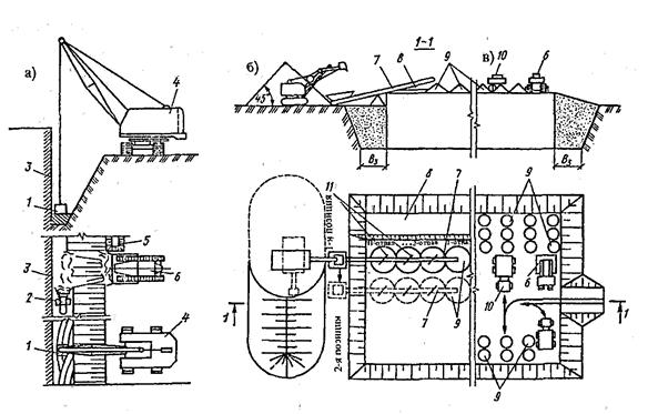 а - засыпка и уплотнение грунта в пазухе котлована, б - устройство насыпи ленточным конвейером, в – то же, автосамосвалами и бульдозерами; 1 - вибротрамбовка, 2 - микробульдозер, 3 - подземная часть сооружения, 4 - кран-экскаватор, 5 - резерв грунта на первый слой, 6 - бульдозер, 7 - конвейер, 8 - спланированная насыпь, 9 - отвалы грунта, 10 - автосамосвалы, 11 - скребки для сбрасывания грунта с конвейра