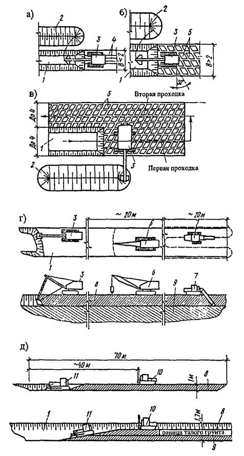 При разработке траншей в мерзлых грунтах чаще всего используют несколько типов машин, каждая из которых подготавливают фронт работ для машин, выполняющих последующие операции. Например, расчистка бульдозером поверхности грунта от снега позволяет приступить к рыхлению или прорезанию мерзлого грунта рыхлителями (баровыми машинами), которые, в свою очередь, подготавливают фронт работ экскаватору и т.д. При глубине промерзания до 1,3 м траншеи, неширокие котлованы можно разработать обратными лопатами с ковшом вместимостью 0,65 м3 и выше при предварительном нарезании прорезей через 0,4... 0,5 м баровой машиной. Причем при ширине траншей до 2 м достаточно сделать продольные прорези вдоль траншей, а при ширине более 2 м делают и поперечные прорези под углом 30°, нарезая при этом блоки в виде ромбов. Широкие траншеи или котлованы (шириной до 8 м) разрабатывают двумя торцовыми проходками экскаватора. При разработке широких траншей для прокладки коллекторов в мерзлых грунтах при значительной глубине промерзания обычно применяют баровые машины, экскаваторы с клинмолотом и экскаваторы с обратной лопатой.