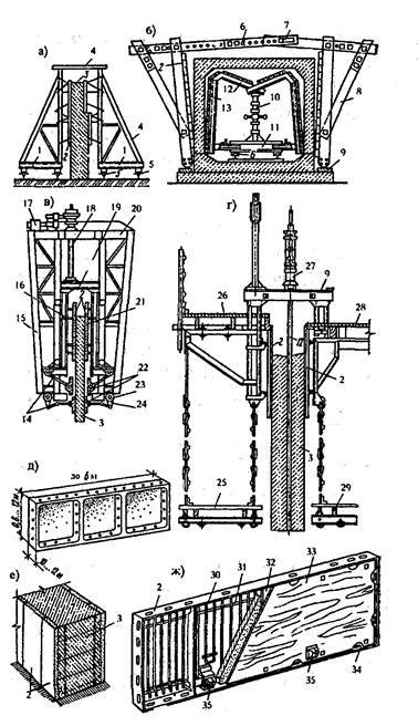 Рис. 5.1 – Виды катучей горизонтально- и вертикально-скользящей опалубки (а, б, в, г), несъемной (д, е) и греющей опалубки (ж)