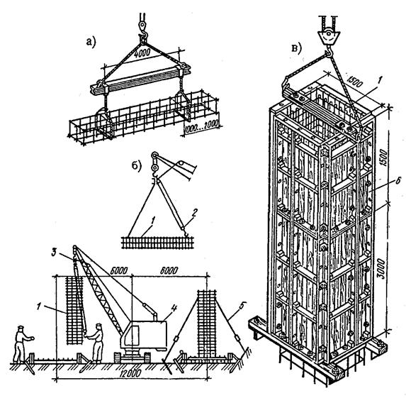 Монтаж арматуры. До установки каркасов и арматурно-опалубочных блоков в проектное положение выправляют и выверяют арматурные выпуски ранее забетонированной конструкции и наводят разбивочные оси. Арматурные каркасы монтируют самоходными кранами с применением специальных траверс (рис. 5.2, а). Каркасы фундаментов и подколонников большой массы при высоте их более 2 м устанавливают краном с использованием самобалансирующихся стропов (рис. 5.2, б). Монтаж арматурно-опалубочных блоков также осуществляют краном (рис. 5.2, в) и установку его начинают с разметки осевых линий, после чего к верху каждой стороны блока крепят инвентарные расчалки и стропят к крюку самобалансирующейся траверсой. Подняв блок, его разворачивают и наводят так, чтобы осевые риски на нем и на основании или фундаменте совпали. Блок опускают, проверяют положение осей и вертикальность установки, после чего закрепляют расчалки. Плоские сетки и каркасы монтируют краном и, если их масса не превышает 100 кг, подают к месту установки пакетами (по нескольку штук). Установку отдельных стержней при армировании производят в опалубке конструкции, установленной в проектное положение.
