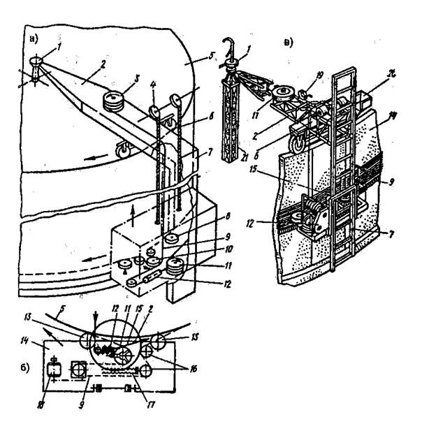 1 - ось вращения, 2 - стрела, 3 - бухтодержатель, 4 - лебедка, 5 - стена сооружения, 6 - верхняя тележка, 7 - вертикальная рама, 8 - нижняя тележка, 9 - цепь, 10 - приводная звездочка, 11 - конический барабан, 12 - механизм торможения, 13 - катки тележки, 14 - подвесная (нижняя) тележка с навивочным устройством, 15 - напрягаемая арматура, 15 - напрягаемая арматура, 16 - направляющие ролики, 17 - натяжное устройство, 18 - электродвигатель, 19 - станок для сращивания проволоки, 20 - место машиниста, 21 - стойка