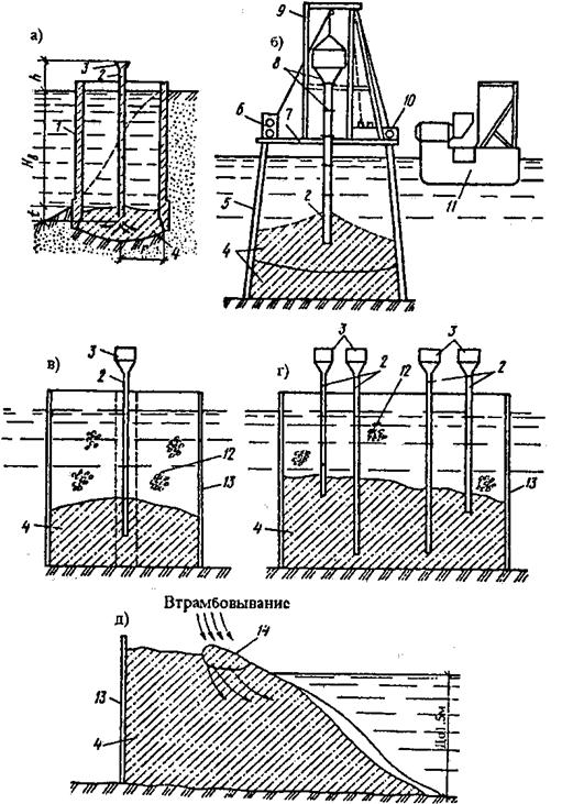 а - укладка бетонной смеси способом ВПТ (в подушку опускного колодца), б - бетонирование способом ВПТ с плавучим бетонным заводом, в - бетонирование способом ВР с шахтой, г - то же, без шахты, д - бетонирование способом втрамбовывания бетонной смеси; 1 - опускной колодец, 2 - заливочные трубы, 3 - воронка, 4 - свежеуложенная и уложенная бетонная смесь, 5 - бездонный железобетонный ящик, 6 - лебедка, 7 - рабочая площадка, 8 - соединение звеньев трубы, 9 - башенный подъемник, 10 - загрузочный ковш, 11 - плавучий бетонный завод, 12 - крупный заполнитель, 13 - опалубка, 14 - новая порция бетонной смеси