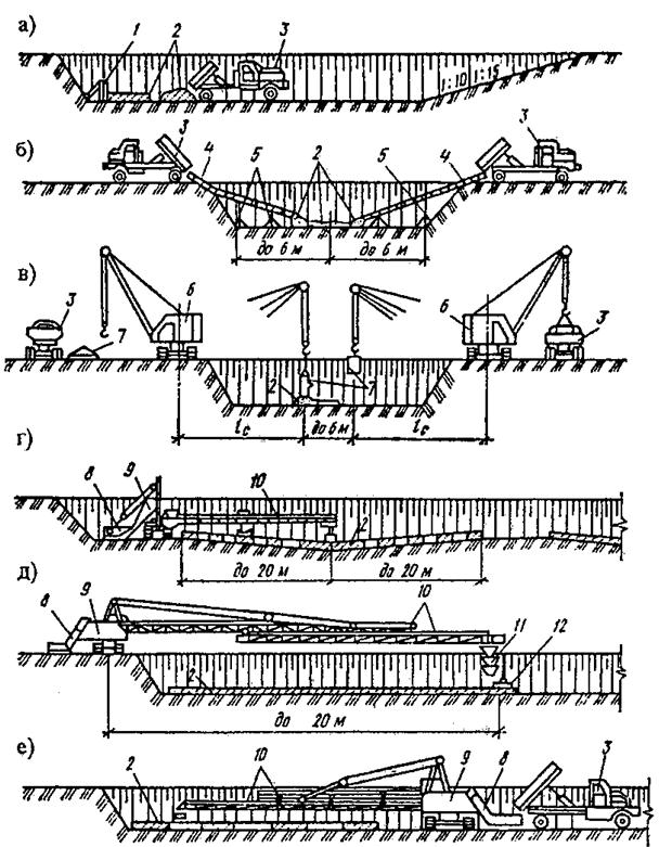 Устройство щебеночной и бетонной подготовки. Способы и схемы выполнения этих процессов выбирают в зависимости от общих габаритов сооружения в плане, плотности грунта в основании и наличия грунтовых вод. При плотных грунтах основания щебень и бетон в котлован доставляют автосамосвалами непосредственно в рабочую зону (рис. 5.10, а) и разравнивают его специальными разравнивателями, смонтированными на экскаваторе. В слабых грунтах, когда заезд в котлован невозможен или размеры сооружения в плане невелики, для подачи щебня и бетонной смеси применяют виброжелоба, загружаемые непосредственно из самосвалов (рис. 5.10, б). Бетон также подают стреловыми кранами в бадьях, загружаемых смесью на заводе и доставляемых в автомобилях (рис. 5.10, в) или на объекте с доставкой смеси автосамосвалами. Используют для этих целей и ленточные бетоноукладчики (рис. 5.10, г - е). Бетоноукладчиком, передвигающимся по берме котлована, подают смесь на полосу шириной до 20 м с каждой стороны, разравнивают и уплотняют ее. Бетонную подготовку сооружений больших площадей (под горизонтальные отстойники, аэротенки и др.) устраивают с помощью автобетоноукладчиков или автобетононасосов (см. рис. 5.10, в), работающих с бермы котлована и укладывающих бетонную смесь в подготовку полосами шириной по 5 - 6 м.