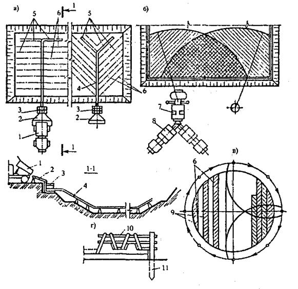 Для эффективной организации процесса укладки смеси в днище его разбивают на полосы бетонирования с соответствующей установкой опалубки и укладки арматуры, с соблюдением последовательности поточного выполнения процессов на захватках. При относительно малых размерах сооружений до 28 - 30 м (прямоугольных или цилиндрических в плане) смесь укладывают полосами или концентрическими кольцами шириной 2 – 4 м последовательно и непрерывно до полного завершения. При больших размерах сооружений в плане укладку ведут через полосу (см. рис. 5.12, г, е) с последующим заполнением оставленных промежутков. Бетонирование днищ больших размеров в плане ведут совмещенным способом при перемещении машины, выполняющей процессы, на днище по специально выстилаемым деревянным щитам или железобетонным плитам - ходам-проездам. При этом работы выполняют последовательными полосами, укладывая одновременно арматуру и бетонную смесь (см. рис. 5.12, в), причем в первый проход крана укладывают арматурные сетки и каркасы для полосы шириной 3 - 4 м, а во второй - смесь. При устройстве бетонных подготовок и днищ емкостных сооружений перспективными являются установки для пневмо-набрызга бетонной смеси (см. рис. 5.7, б). При этом по шлангам с помощью сжатого воздуха подают сухую бетонную смесь, которую на выходе из концевого сопла смешивают с водой. Бетонная смесь выбрасывается с большой скоростью (до 120 м/ч.), благодаря чему образуется при укладке очень плотный слой бетона, не требующий дополнительного уплотнения. Для выполнения набрызг-бетонных работ применяют специальный комплект машин (см. рис. 5.7), главной из которых является бетон-шприц-машина.