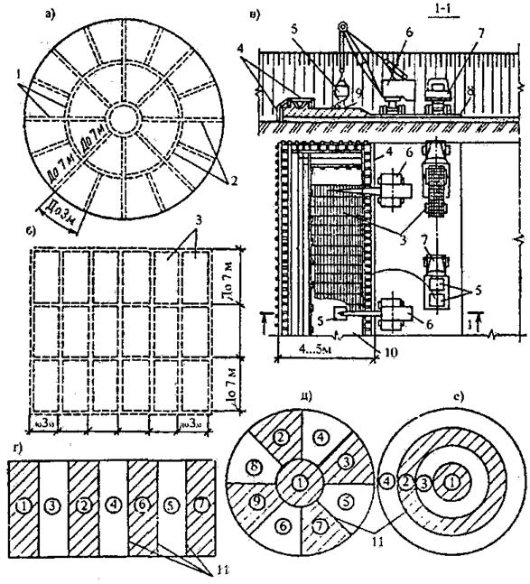 Арматуру днища монтируют из арматурных сеток, каркасов или отдельных стержней. В цилиндрических сооружениях днища делят концентрическими окружностями, которые затем дополнительно делят на секторы трапецеидальной формы (рис. 5.12, а). По размерам этих секторов изготавливают арматурные каркасы, размеры которых соответствуют габаритам транспортных средств. Для армирования днища используют также арматурные сетки из стержней диаметром 5 - 8 мм (в зависимости от размера днища сооружения), которые свертывают в рулоны. На объекте рулоны разворачивают, вытягивают и укладывают в проектное положение. Для прямоугольных сооружений применяют арматурные сетки и каркасы размерами, кратными размерам секций или захваток (рис. 5.12, б). В прямоугольных сооружениях небольших размеров раздельная установка опалубки, арматуры и укладка бетонной смеси последовательными потоками часто бывает затруднительна. Поэтому в таких случаях эти процессы выполняют одним потоком с применением одного или двух кранов, передвигающихся по уложенным деревянным щитам или железобетонным плитам (рис. 5.12, в). Работы при этом ведут последовательными полосами или чаще через полосу (рис. 5.12, г). За первый проход краном укладывают арматурные сетки или каркасы для полосы шириной 2 - 4 м, а за второй - бетонную смесь. При движении крана в обратном направлении перекладывают дорожные плиты в новое положение (для бетонирования следующей полосы) и одновременно переставляют опалубку с первой полосы на вторую или устанавливают ее заново.