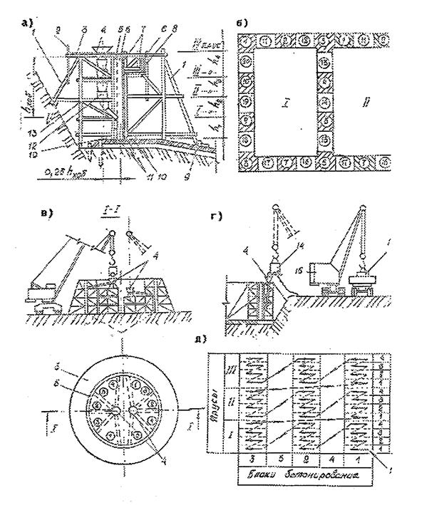 а – общая схема бетонирования стены и разбивка ее на ярусы, б – разбивка стен на захватки (римские цифры) и блоки бетонирования (арабские цифры), в, г – подача бетонной смеси бадьями с помощью крана, д – последовательность установки опалубки и укладки бетона; 1 – подкос, 2 – ограждение, 3 – рабочий настил, 4 – приемный бункер, 5 – границы щитов опалубки, 6 – бетонируемые конструкции, 7, 8 – опалубка лотка и ее каркас, 9 – упор, 10 – прижимная доска, 11 – ребра жесткости, 12 – хобот звеньевой, 13 – опора подмостей, 14 – вибробадья, 15 – кран (цифрам в кружках указана последовательность бетонирования стен; h1 – h4 – высоты ярусов)