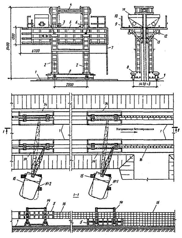 1 - опалубка, 2 - щебень или бетонная смесь, 3 - автосамосвал, 4 - виброжелоб, 5 - опоры, 6 - кран, 7 - бадьи, 8 - скиповой подъемник, 9 - бетоноукладчик, 10 - конвейер, 11 - хобот, 12 - вибратор