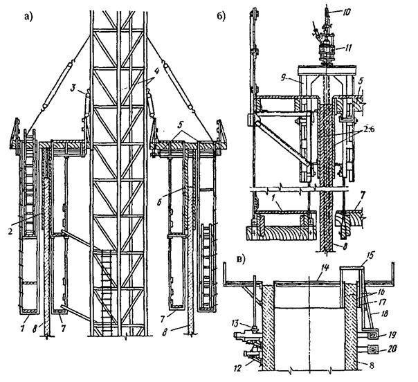 1, 7 – наружные и внутренние подвесные подмости, 2, 6 – щиты наружной и внутренней опалубки, 3 – ручные тали для подъема опалубки, 4 – шахтоподъемник, 5 - опорная кольцевая ферма с рабочей площадкой, 8 – стены возводимого сооружения, 9 - домкратная рама, 10 – домкратный стержень, 11 – домкрат, 12 – цанговые зажимы, 13 - винтовые подъемники, 14 – рабочая площадка, 15 – П-образные рамы, 16 – щиты внутренней и наружной опалубки, 17 – кружала, 18 – опорные стойки, 19, 20 – верхние и нижние опорные кольца