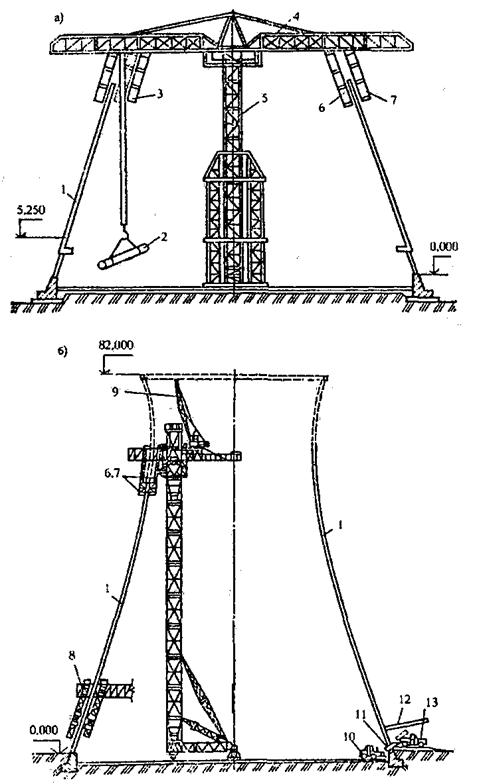 На схеме (рис. 5.16, б) показан пример бетонирования оболочки градирни специальным одноконсольным краном, оборудованным подвесными подмостями-люльками для производства бетонных работ на высоте. Основание башни крана опирается на тележки для перемещения его по кольцевому пути.