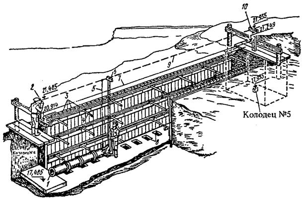 1 - укладываемый трубопровод, 2 - пришивная визирка №1, 3 - крепление траншеи, 4 - инвентарные распорки (струбцины), 5 - отвес, 6 - ходовая визирка, 7 - проволока (причалка), 8 - приямки для заделки раструбов, 9 - линия визирования, 10 - пришивная визирка №2
