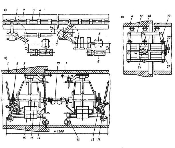 Одним из более простых предложенных устройств является приспособление для стыковки труб к бульдозеру (рис. 6.17, а), которое состоит из двух однотипных тележек - якорной и стыкующей. Тележки в трех местах (через 120° в вертикальной плоскости) оборудованы выдвижными опорными плитами, фиксирующимися пальцами. Перекатывание тележек внутри трубы производится вручную. В монтажном положении концы троса закрепляют на стыкующей тележке и через блок якорной тележки прикрепляют к бульдозеру.