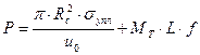 где Rc- радиус сечения отверстия (скважины) в грунте; σупл- коэффициент сопротивления грунта; u0 - пористость грунта до прокалывания; Мт - масса 1 м трубы (футляра), кг; L - длина проходки (прокола), м; f - коэффициент трения стали о грунт.